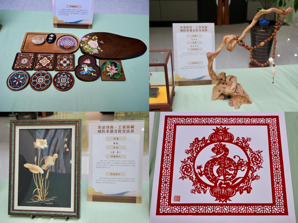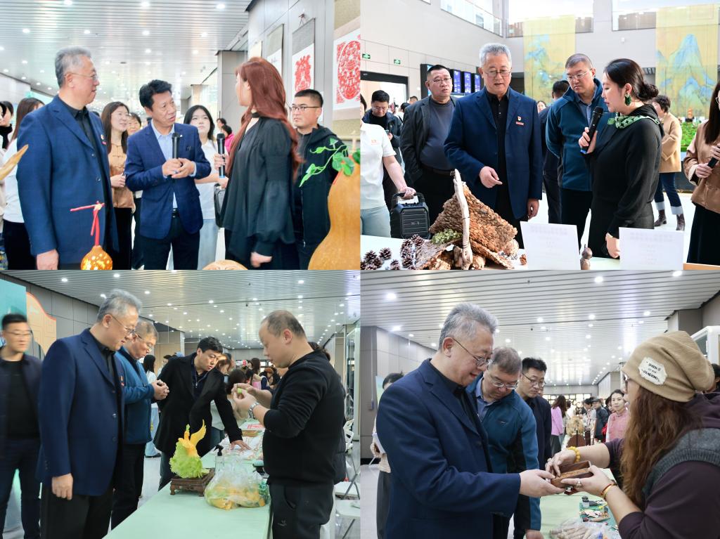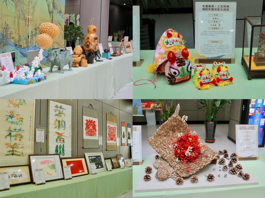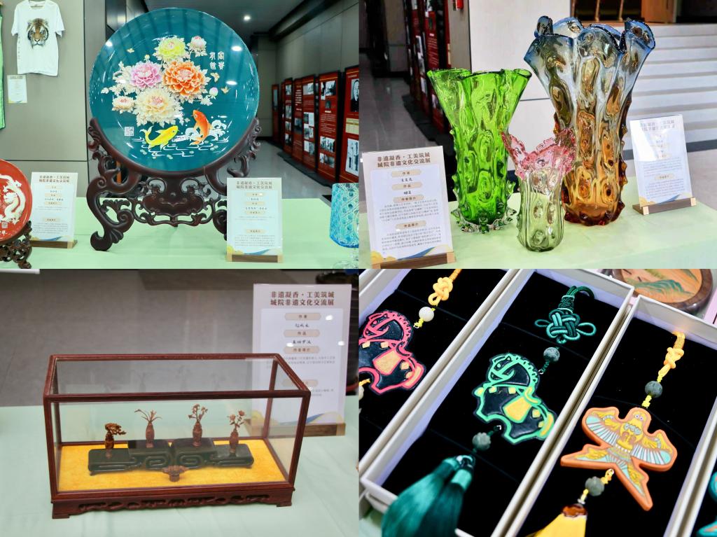 师生结合现代设计理念创作的非遗文创作品。精美的木雕作品纹理清晰、栩栩如生;细腻的刺绣针脚工整、纹样雅致;古朴的陶瓷器具釉色莹润、造型独特,引得现场师生驻足观赏、拍照留念。