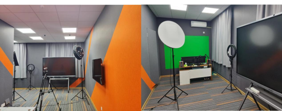 视频录制教室,为师生提供录制和直播平台,是全校精品课录制、常态化录播及各种竞赛的专用教室。配有音视频采集系统和86英寸超高清智慧屏、智能电视等。系统运用了创新的前景植入技术,避免了教师对板书内容造成的遮挡问题,实现了教学内容的完美呈现。操作简单,通过一键录制按钮即可实现高质量视频录制。