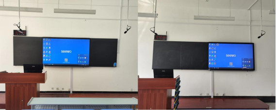 其中普通智慧教室是2024年新建的配置有智慧黑板的一种新型多媒体教室,86英寸超高清智慧屏内置高配置电脑、配置无感扩声系统、智能中控系统等。设备操作简单,只需刷卡实现上课全过程自动控制。